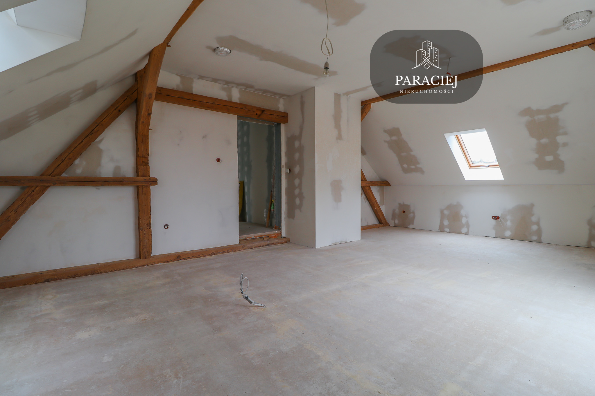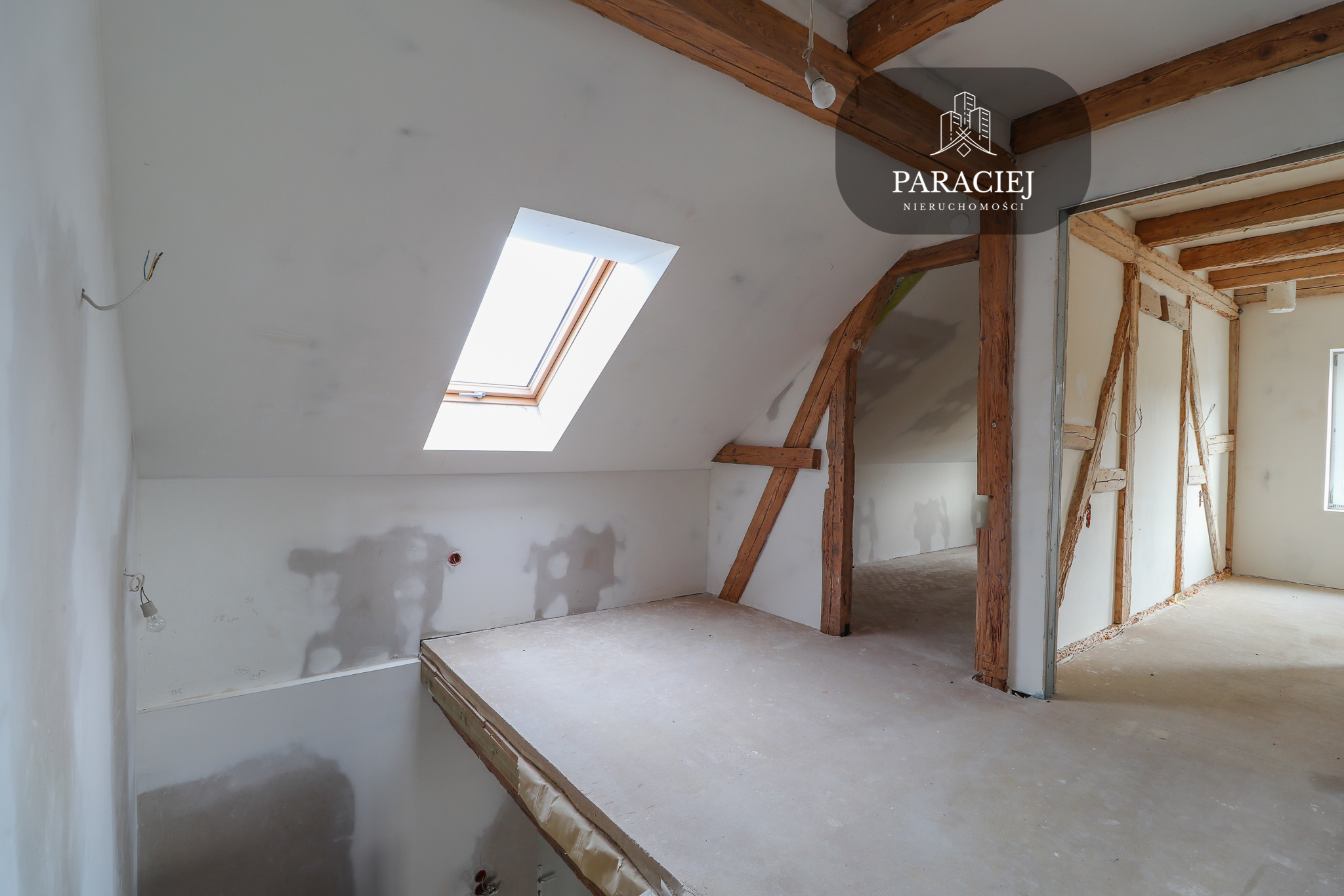Na tej kondygnacji w pokojach zostały wyeksponowane oryginalne belki, które nadają temu miejscu wyjątkowy klimat. Pasjonaci tego rodzaju nieruchomości docenią to wnętrze.