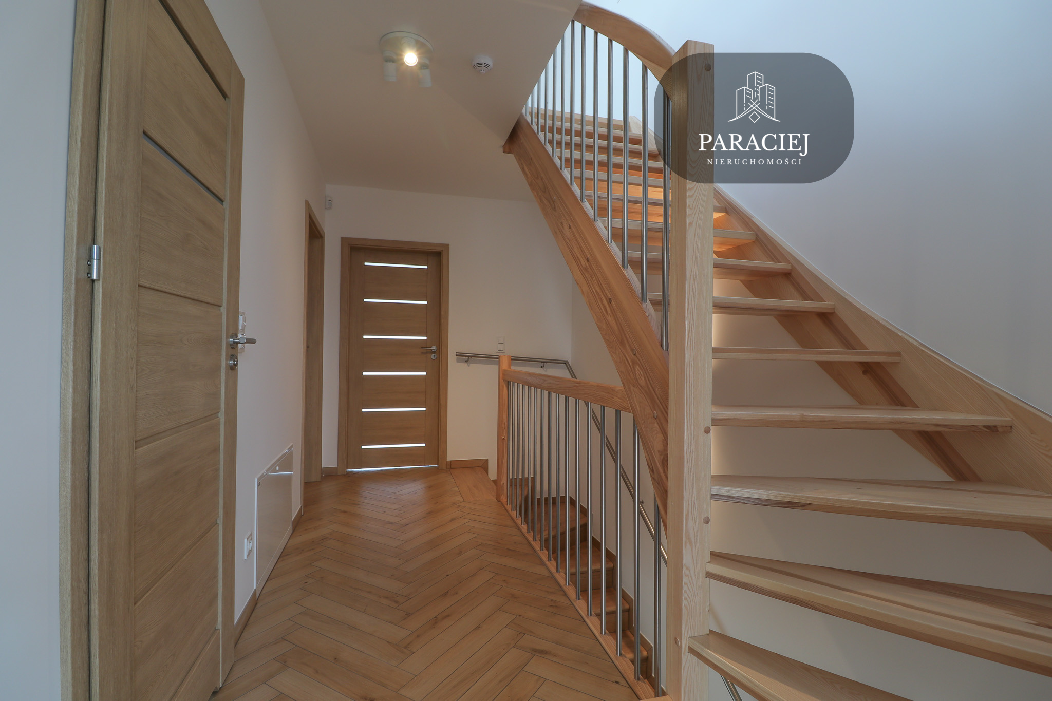 Drewniane schody prowadzą do czwartej sypialni – idealnej jako pokój gościnny, gabinet albo miejsce dla nastolatka.