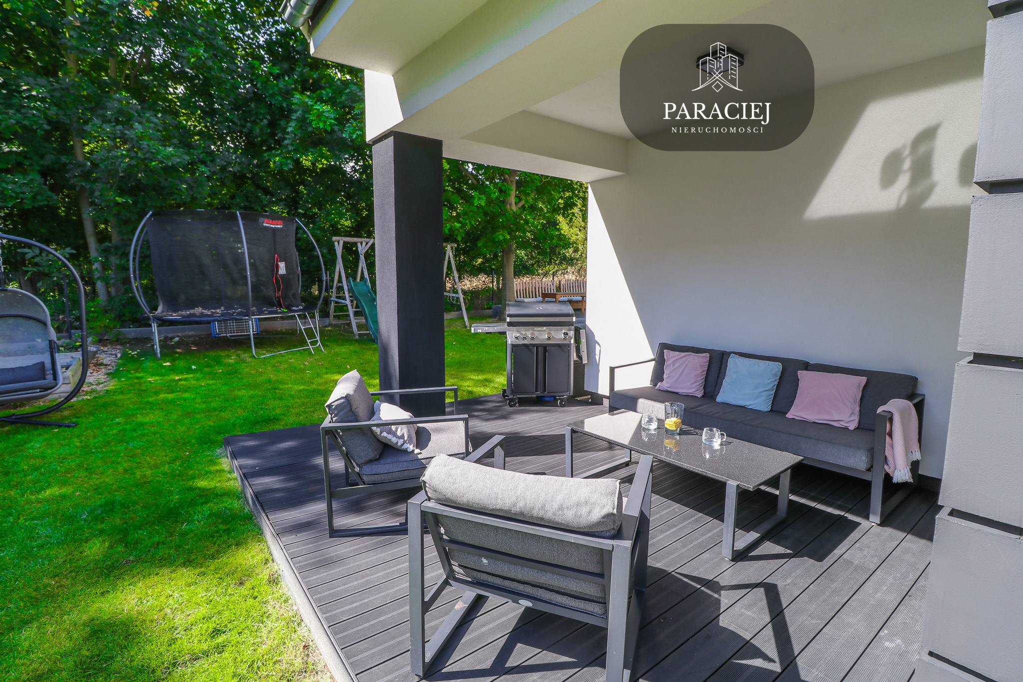 Tu naprawdę odpoczniesz. Taras z oświetleniem, miejsce na grilla i spotkania w większym gronie, plac zabaw dla dzieci, otoczenie drzew, tui, kwiatów i co najważniejsze – las tuż za ogrodzeniem.