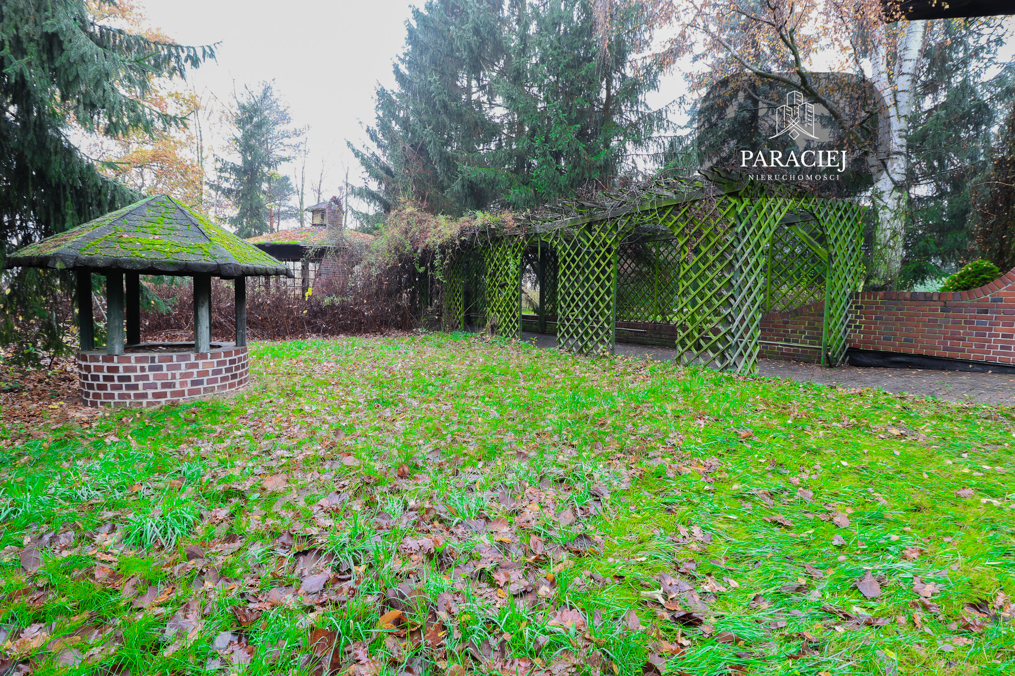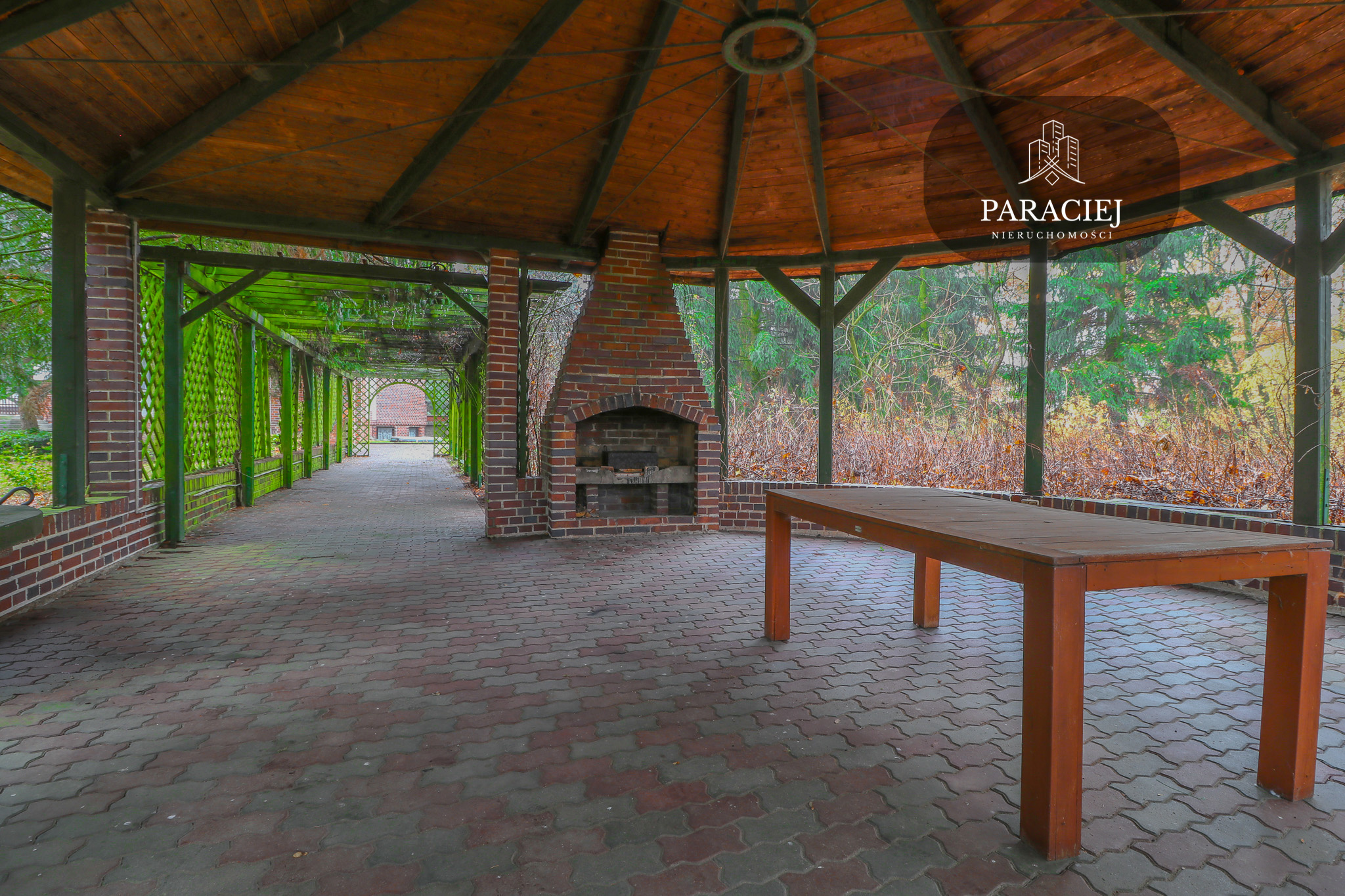- drewniana pergola z murowanym grillem – idealna przestrzeń na letnie przyjęcia, biesiady oraz spotkania z bliskimi,