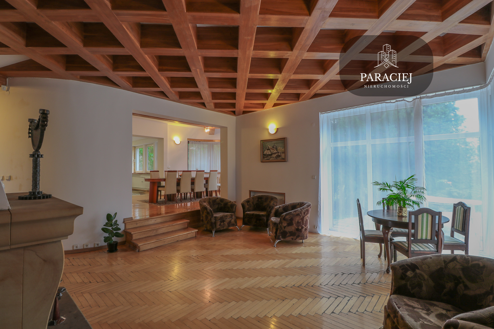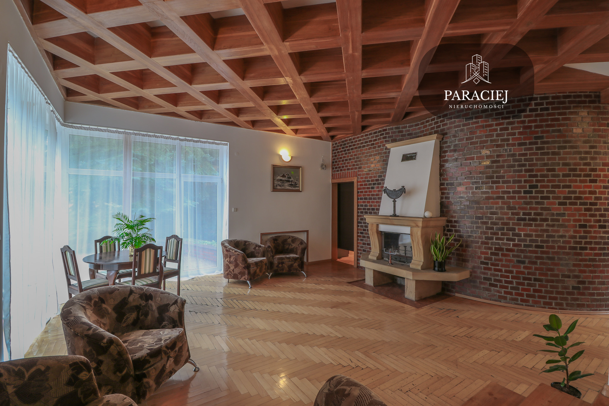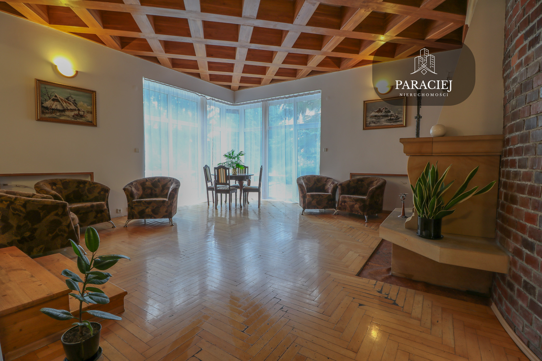 - sala kominkowa wyłożona parkietem, dużymi przeszkleniami z wyjściem na taras, ogród oraz basen zewnętrzny – serce domu, idealne do wspólnych spotkań,